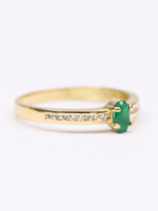 Anillo medio sin fin, de oro amarillo con piedra central, circonia verde. Pieza con sencillo diseño, destacada por aportar una chispa de color